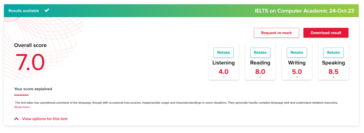 You're eligible to book IELTS One Skill Retake after you have recently completed a full test on computer and received your IELTS test score, from an eligible test centre. You must book your IELTS One Skill Retake within 60 days of your original test date. Check the FAQ section below for more information about IELTS One Skill Retake.
